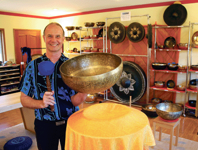 Here in the states, the music therapist calls his practice Heaven of Sound. A visit to his home office south of Sandpoint shows that the name is perfectly suited to what Michaelis does for a living. In one room, the walls are lined with shelf upon shelf of Tibetan singing bowls, Burma gongs and tubular bells. Also on display are the Native American flutes, shamanic drums, tuned boxes, xylophones and sound wheels that are handcrafted in his workshop.