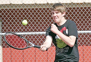 CJ Beard teamed with Alex Day vs. James Cope and Jacob Edstrom of Clark Fork at No. 2 doubles May 6, 2014.