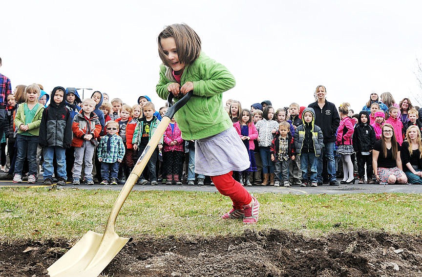 Stillwater Christian preschooler Ava Stillo leans into her shovel during the groundbreaking ceremony for the $1.8-million expansion of the school on Wednesday. (Aaric Bryan/Daily Inter Lake)
