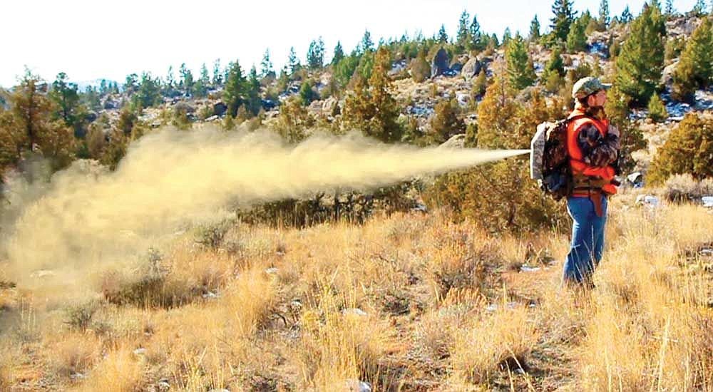 Tim Lynch sprays the Bear Attack Pack backwards out of a backpack in a demonstration. The canister can be discharged much like pulling the ripcord on a parachute. The pack fits any size can of bear spray. (AP Photo/courtesy of BearSpray.com)