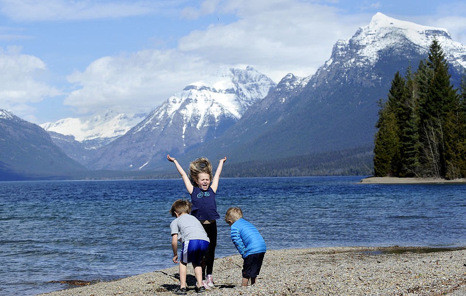 Serenity Saugen throws water in the air as her brothers Micah, left, and, Kyler search for rocks to throw in Lake McDonald while spending time at their favorite beach in Glacier National Park on Monday. (Aaric Bryan/Daily Inter Lake)