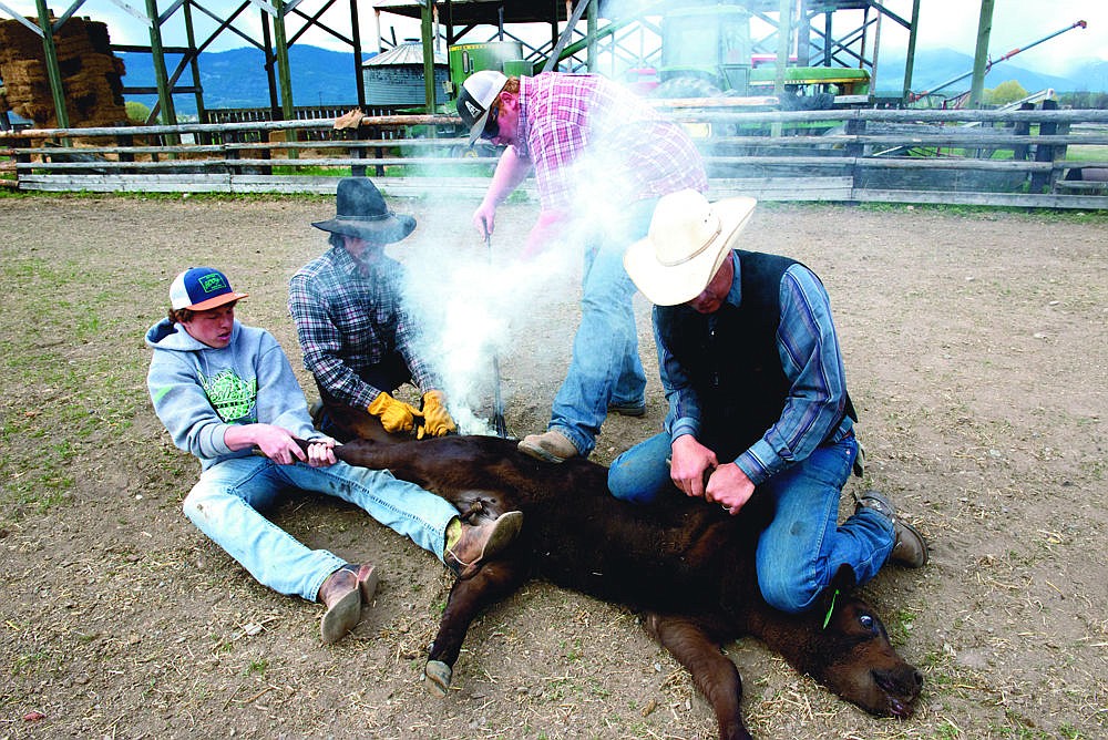 Ryan Ovitt, Mike Holland and Dallas Deardorff work together to brand a calf, last Saturday, at the Holland Ranch.