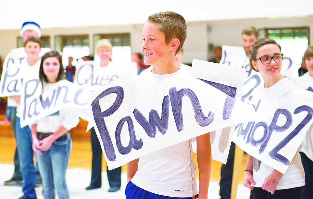 Ethan Brown (center) stands as a pawn during last week's chess game in Thompson Falls.