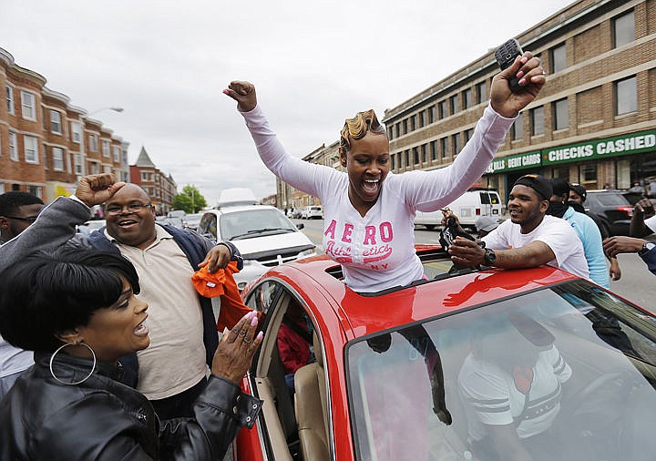 Adrian Roberson, right, celebrates as the Rev. Pamela Coleman, left, speaks on Friday, May 1, 2015, after State's Attorney Marilyn J. Mosby announced criminal charges against all six officers suspended after Freddie Gray suffered a fatal spinal injury while in police custody in Baltimore. Mosby announced the stiffest charge, second-degree depraved heart murder, against the driver of the police van. Other officers faced charges of involuntary manslaughter, assault and illegal arrest. (AP Photo/David Goldman)