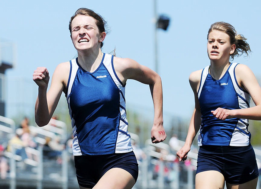 Glacier's Ahna Kreitinger pushes ahead of teammate Bailey Smith on the homestretch of the 800-meter run during the 2015 Archie Roe Invitational. Kreitinger and Smith finished one-two in the race. (Aaric Bryan/Daily Inter Lake)