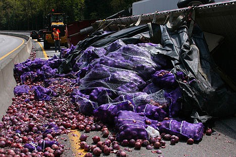A loader and dump truck were transported to the scene to clean up the mess. The onions fell onto both sides of the freeway, but the westbound side was quickly cleared, causing only minimal delays to those lanes.