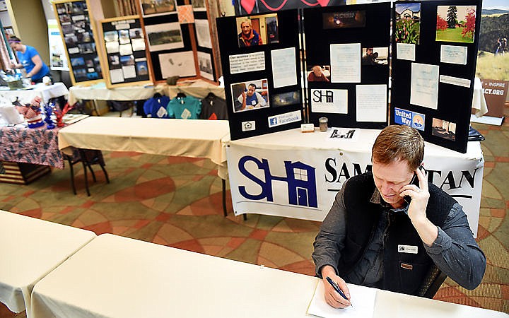 Chris Krager, executive director of Samaritan House, takes a call from a donor at the Give Local Flathead event on Tuesday at the Hampton Inn in Kalispell. The 24-hour fundraising event brought in almost $62,000 for local nonprofit organizations. (Brenda Ahearn/Daily Inter Lake)