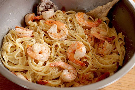 To gussy up this dish a bit, I added pepper-roasted shrimp, which are tossed in with the pasta just at the end. But if shrimp doesn't suit your mom, you could easily substitute chopped cooked (and hot) chicken breasts, crispy hunks (make them big) of bacon, or strips of smoked salmon.