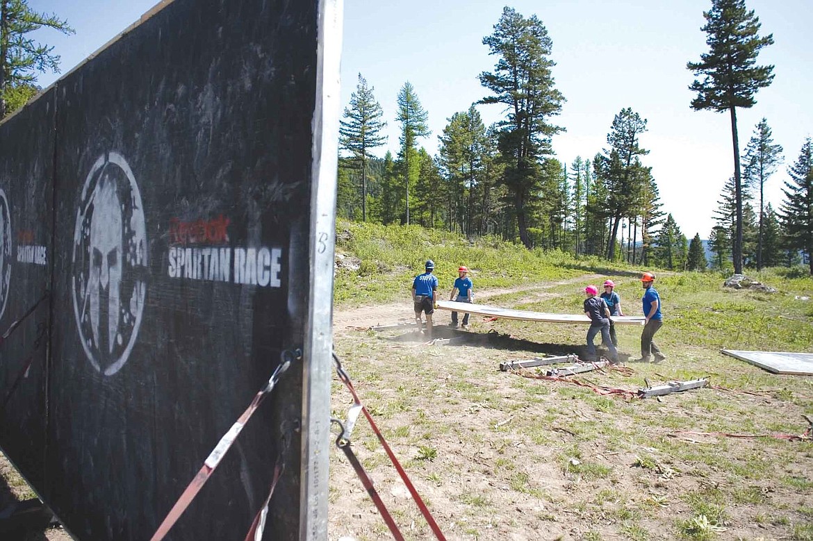 Spartan Race staffers and volunteers set up obstacles on Monday. (Sally Finneran/Bigfork Eagle)