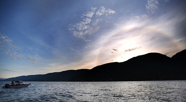 Mike Benson of Lonepine, fishes under the light of a halo around the rising sun near Yellow Bay on Thursday, May 7, on Flathead Lake. Benson has won top honors in three of the Mack Days Tournaments and been in the top five in 15 of them. Mack Days is a biannual fishing tournament that takes place weekends in the spring and fall. The current tournament began on March 20, and will wrap up at 3 p.m. on May 17. (Brenda Ahearn/Daily Inter Lake)