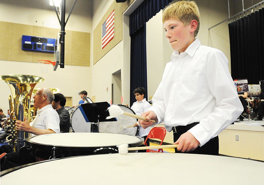 Zaybin Stewart of Trinity Lutheran plays the tymphanies during the Rural Music Teachers Association Advanced Band Festival at Cayuse Prairie School on Thursday. (Aaric Bryan/Daily Inter Lake)