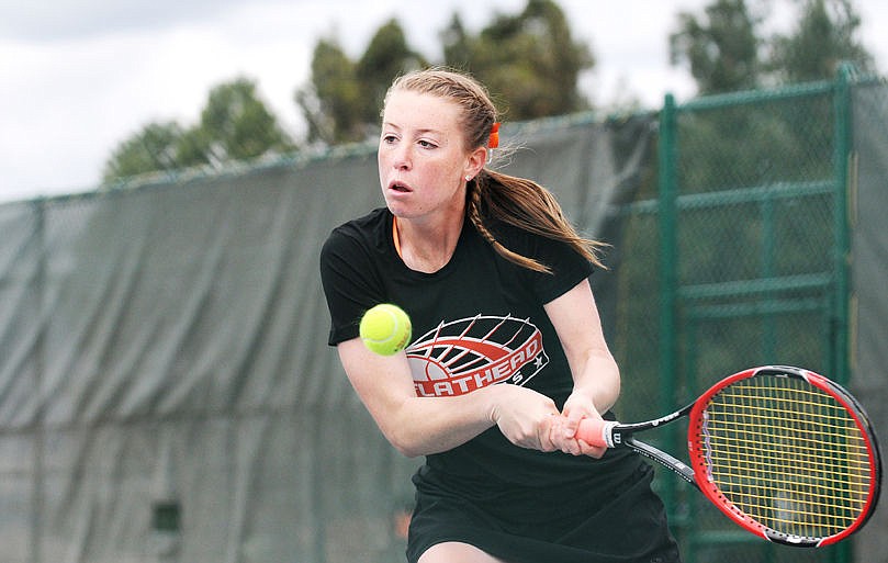 Flathead's Jenna Jensen smashes a return in her Northern AA semifinal match against Lucia Barbeito at Flathead Valley Community College on Friday. (Aaric Bryan/Daily Inter Lake)