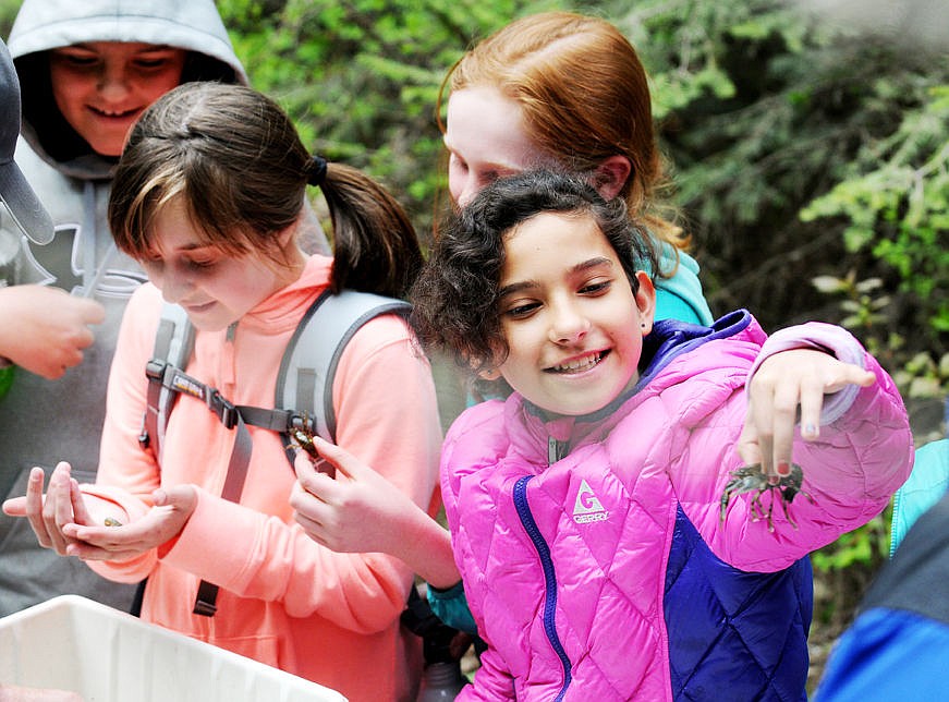 Edgerton fifth-grader Abby Garza holds up a crayfish at the fisheries station of the Family Forestry Expo at Trumbull Creek Experimental Forest on Friday. (Aaric Bryan/Daily Inter Lake)