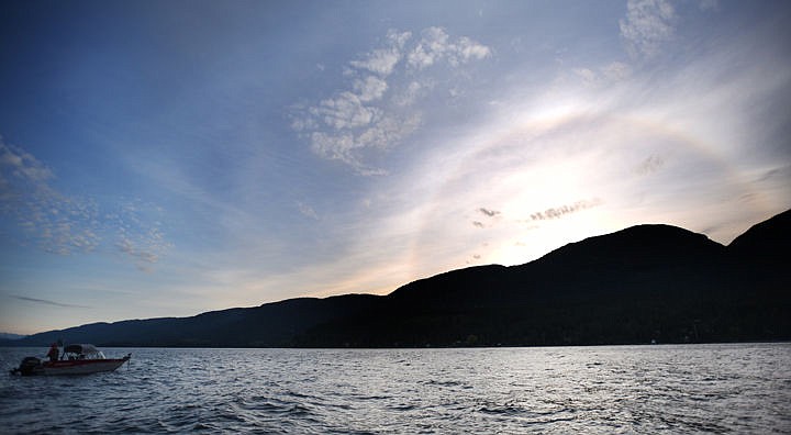 Mike Benson of Lonepine, fishes under the light of a halo around the rising sun near Yellow Bay on Thursday, May 7, on Flathead Lake. Benson has won top honors in three of the Mack Days Tournaments and been in the top five in 15 of them. Mack Days is a biannual fishing tournament that takes place weekends in the spring and fall. The current tournament began on March 20, and will wrap up at 3 p.m. on May 17. (Brenda Ahearn/Daily Inter Lake)