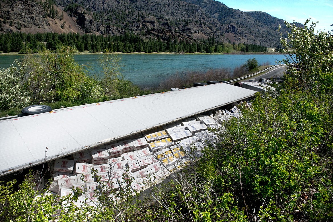 An overturned tractor trailer carrying a load of apples rests in a ditch along Highway 200 near mile marker 87.