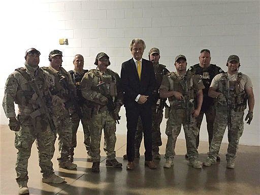 In this photo provided on Monday, May 4, 2015 by Geert Wilders, Dutch lawmaker Geert Wilders, leader of the anti-Islam Freedom Party, center, poses for a photograph with police officers who responded to a shooting outside a provocative contest for cartoon depictions of Prophet Muhammad in Garland, Texas. Two gunmen were killed Sunday, May 3, 2015 in Texas after opening fire on a security officer outside a provocative contest for cartoon depictions of Prophet Muhammad, and a bomb squad was called in to search their vehicle as a precaution, authorities said. (Geert Wilders via AP)