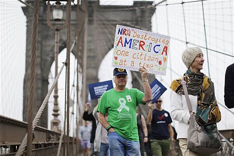 NEW YORK - Hundreds of men, women and children including fashion designer Donna Karan marched across the Brooklyn Bridge on Saturday demanding stricter gun laws and offering a litany of violent stories to show why such laws are needed.