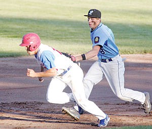 Missoula Pioneers' Koahl DeShazer gets caught in a rundown by shortstop Dylon Lane second out top of one May 8.