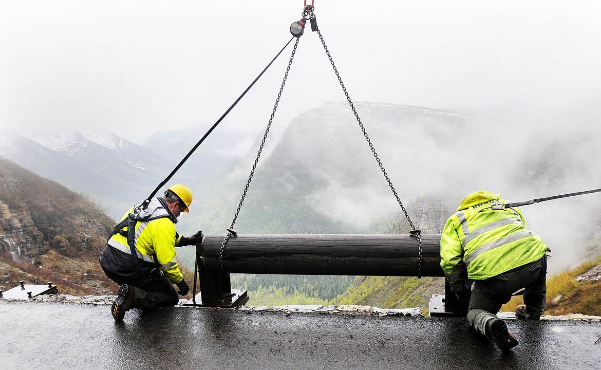 Treyson Hopkins, left, and Lucas Fisher place a guardrail on Going-to-the-Sun Road near Haystack Falls on Monday in Glacier National Park. (Aaric Bryan/Daily Inter Lake)
