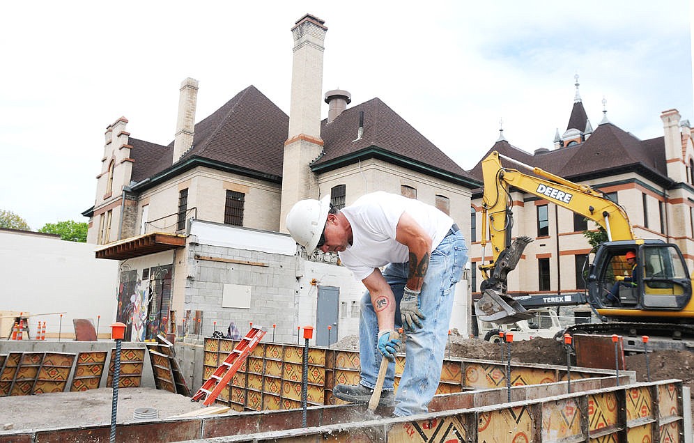 Scott Novak removes the concrete form panels for the foundation of the Flathead County's historic old jail building. The nearly $4 million renovation and expansion of the building is scheduled to be complete by April 2016.
