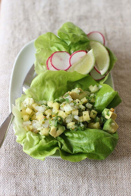 Once the shrimp has marinated, drain and discard the juice. Return the shrimp to the bowl and add the chopped pineapple core, onion, chilies, ginger (if using), avocado and cilantro. Toss well, then season with salt and pepper. Serve immediately with butter lettuce leaves (to use as wraps and cups). Offer sliced radishes and lime wedges on the side as toppings.
