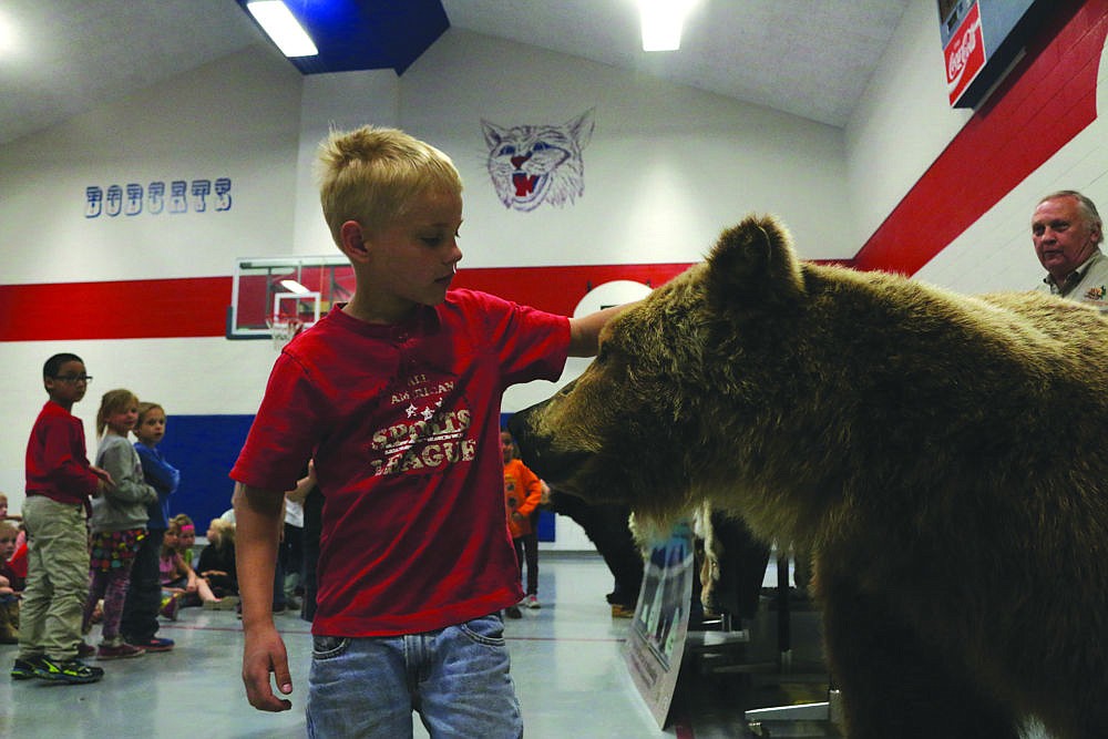 Chris Wood examines a stuffed grizzly bear during a presentation in Superior last week.