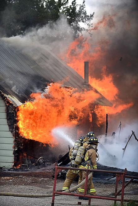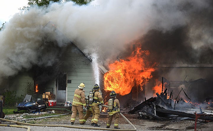 Fire tore through a house on Brunner Road southwest of Columbia Falls Thursday evening, creating a total loss for the main home and garage.