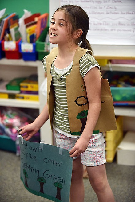 Anna Belle Tretter, a second grader in Amanda Aleman's class, gives her presentation on why students should visit and shop at her Funky Town Recycling Center on Friday, May 15, at Kila School. (Brenda Ahearn/Daily Inter Lake)