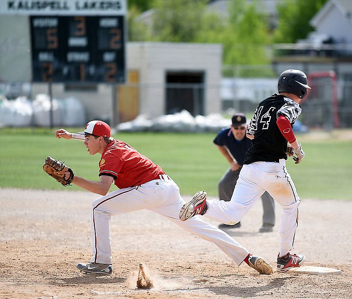 Kalispell first baseman Spencer Pisk (7) makes the out at first in the game against Calgary on Friday, May 15, in the Kalispell Lakers 2015 Canadian Days Tournament in Kalispell. (Brenda Ahearn/Daily Inter Lake)