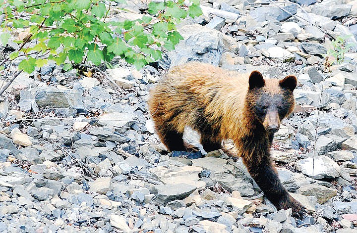 Nate Chute/Daily Inter Lake A young grizzly bear walks along a rocky surface below the West Side Tunnel on Tuesday.