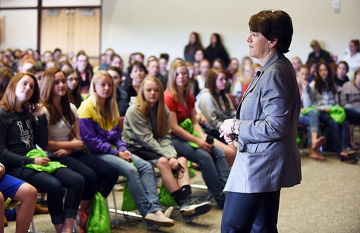 Jane Karas, president of Flathead Valley Community College, welcomes more than 400 students to the Expanding Your Horizons event on Tuesday, May 19, in Kalispell. (Brenda Ahearn/Daily Inter Lake)