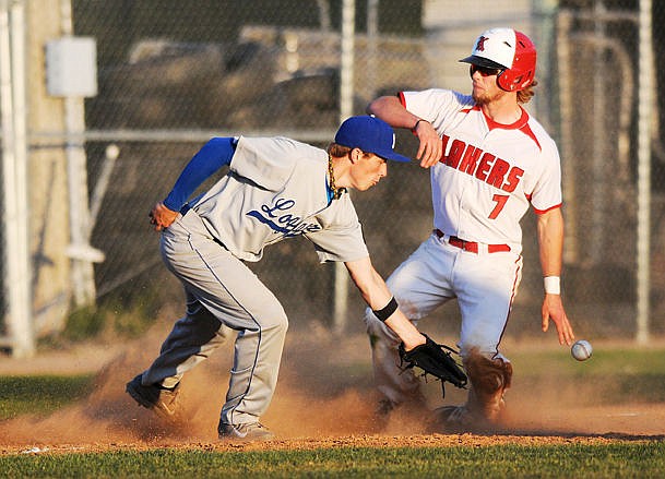 Kalispell Laker Brandon Maassen slides into third as Libby third baseman Dylon Lane reaches for a ball during the Lakers' 11-3 win at Griffin Field on Wednesday. (Aaric Bryan/Daily Inter Lake)