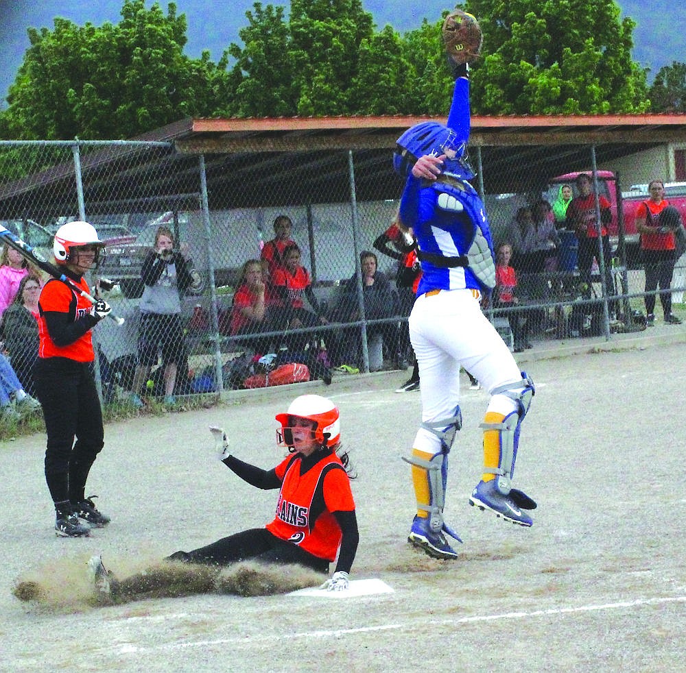 Plains senior Sami Kinzie slides in safe during the Trotters 16-5 win over Thompson Falls.