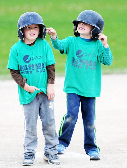 Ellis Fox messes with Cameron Field's helmut as the two stand on third base. (Aaric Bryan/Daily Inter Lake)