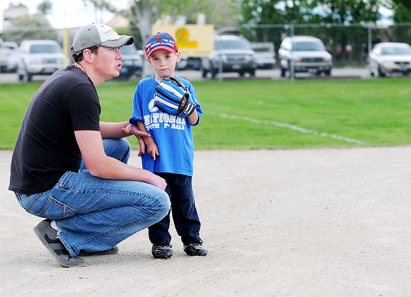 Brent Foley instructs his son Owen before the start of a T-ball game at the Conrad Complex. (Aaric Bryan/Daily Inter Lake)