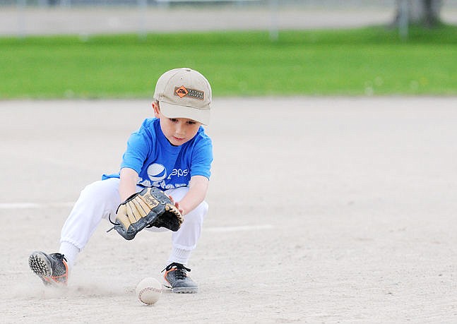 Logan Cox charges a grounder during a 4 and 5-year-old T-ball game. (Aaric Bryan/Daily Inter Lake)