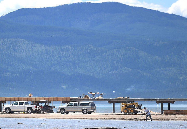 A forklift removes SmartLam panels Thursday from a raised road built as part of a bridge construction project on the north shore of Flathead Lake. The access road built atop the exposed lakebed led to a cease-and-desist order from the Army Corps of Engineers. (Brenda Ahearn/Daily Inter Lake)