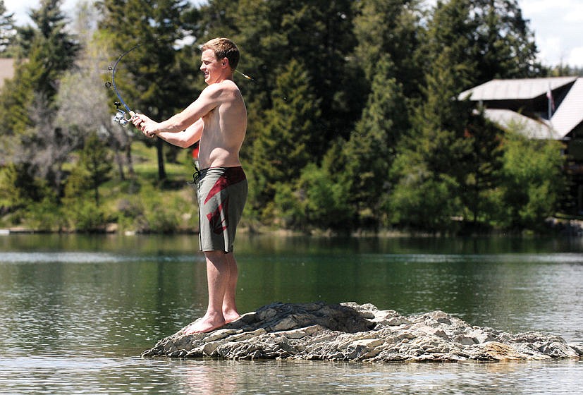 Shawn Whitman of Columbia Falls casts from a rock on Foy’s Lake on Thursday. Whitman said it was such a nice day that he decided to get out and get some sun. (Aaric Bryan/Daily Inter Lake)