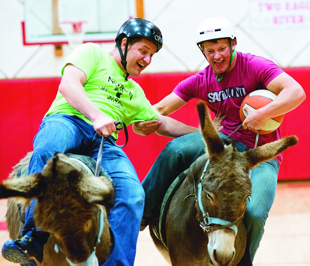 Left to right, Jared VanVleet and Gary Wadman wrestle over a basketball during the donkey basketball game.