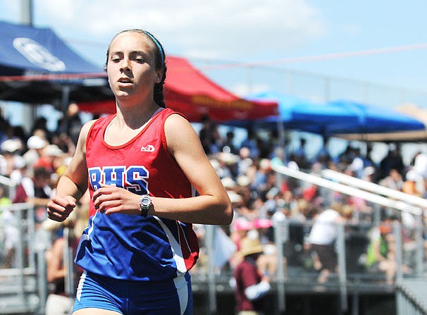 Bigfork’s Bryn Morley starts the final lap of the 1,600-meter run during the Class B state track and field meet and Legends Stadium on Friday. Morley won the event with a time of 4 minutes, 47.76 seconds. (Aaric Bryan/Daily Inter Lake)