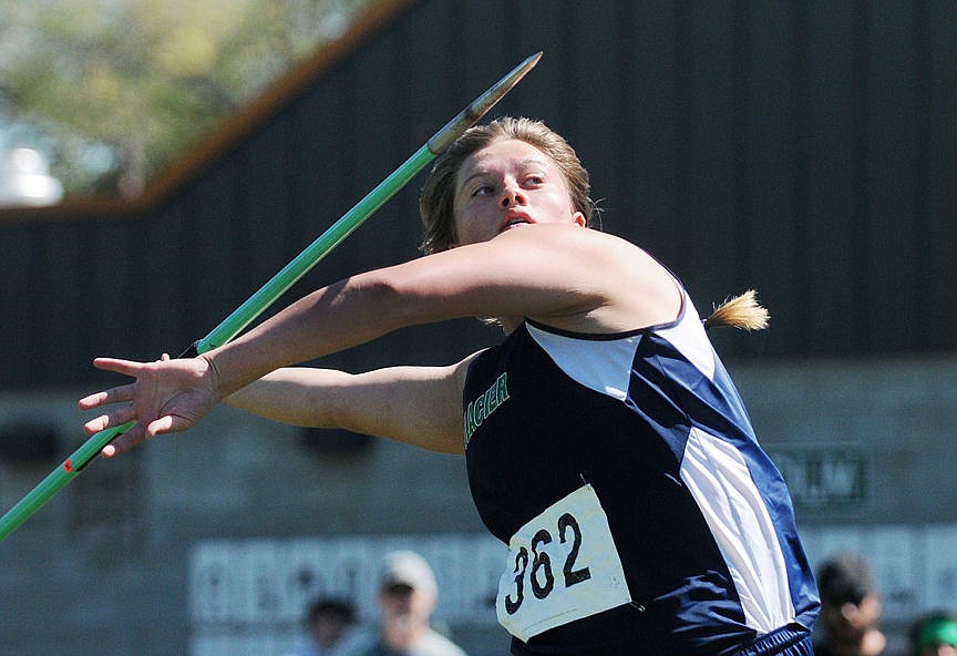 Glacier senior Keyawna Larson throws the javelin at the Class AA state track meet Friday morning at Legends Stadium. Larson won the event for the third-straight year and set a Class AA state record with a throw of 144 feet, 7 inches. (Aaric Bryan/Daily Inter Lake)