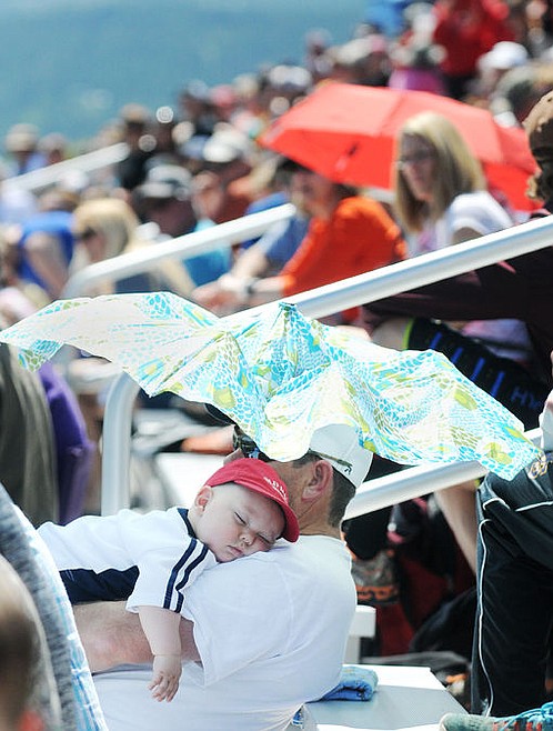 Hudson Worthington takes a nap in the shade Friday as his father, Kirk, watches the 100-meter dash during the Class AA and B state track meets at Legends Stadium in Kalispell. The final day of state events is today. Full coverage of state track starts on Page B1. (Aaric Bryan/Daily Inter Lake)