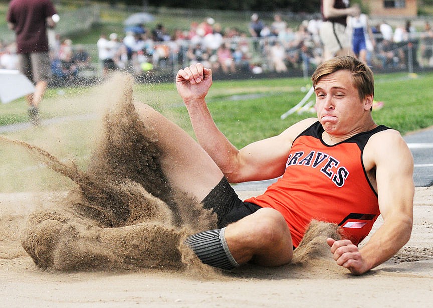 Troy's Scott Pate crashes into the pit during the long jump at the Class B state track and field championship in Kalispell on Friday. Pate finished in second with a jump of 20 feet, 11.5 inches. (Aaric Bryan/Daily Inter Lake)