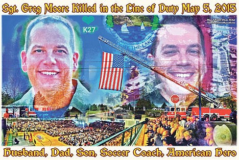 The two prominent photos on the poster are of Moore. One is his official Coeur d'Alene Police Department photo, while the other depicts him as "just a regular guy," Golub said, which is what he really wanted to capture - that Moore was not only a police officer, he was a husband and father.