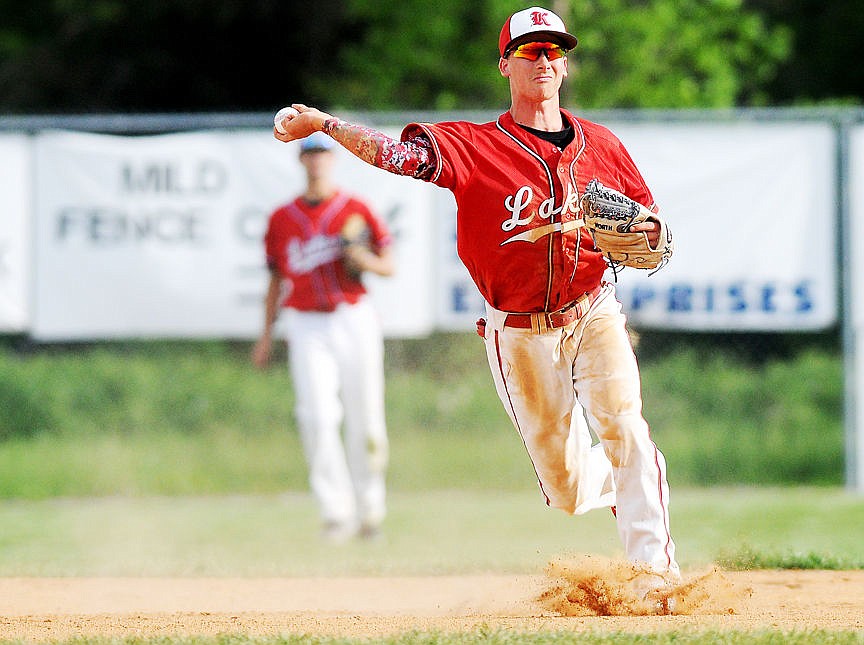 Kalispell Lakers A shortstop Brooks Krause guns down a Libby Logger runner during the top of the second inning at Griffin Field on Wednesday. (Aaric Bryan/Daily Inter Lake)