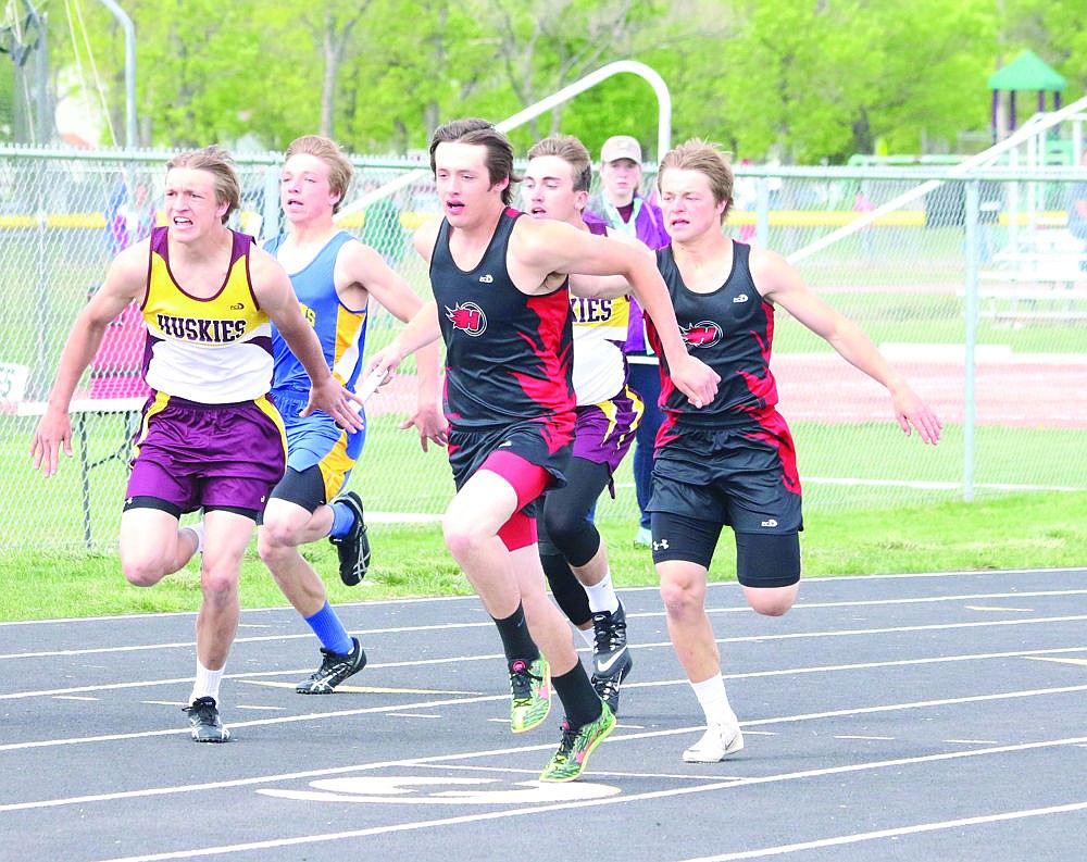 Trevor Paro (far right) hands off the baton to a teammate during last week's state meet in Laurel.