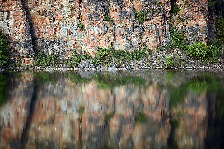 A cliff face is reflected in Sunday Lake on Sunday, May 24, near Stryker. (Brenda Ahearn/Daily Inter Lake)