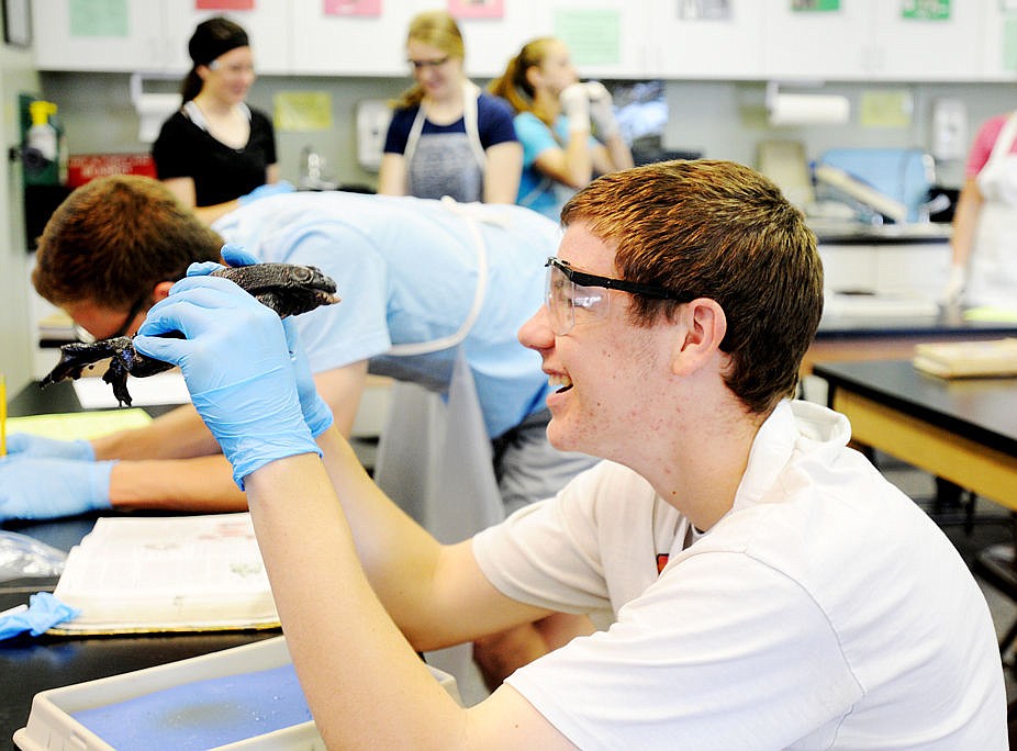 Stillwater Christian junior Clayton Hashley dissects a frog during biology class at the school on Thursday. (Aaric Bryan/Daily Inter Lake)