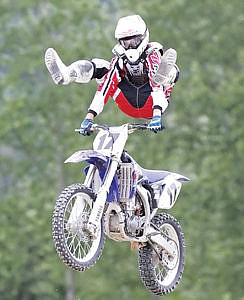 Eighteen year old Jordan Winkelseth of Bonners Ferry, wows the crowd with a "heel clicker" as he takes the checkered flag in the 250 Pro Class Sunday afternoon.