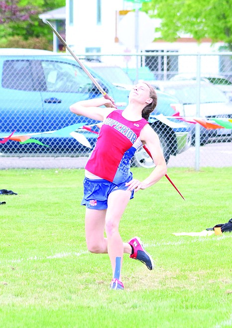 Marissa Koke of Superior heaves the javelin at the state meet in Laurel last weekend.